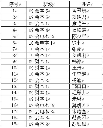 同时由于网上报名系统不明原因,现有个别同学的准考证无法打印,经与郑州市财政局沟通,其承认确实由于系统原因可能出现类似的问题,其给出的解决办法是:请相关同学(见下附表)本人携带身份证于11月10前到郑州市财政局进行本人信息登记,具体名单公布如下,请大家相互转告。
