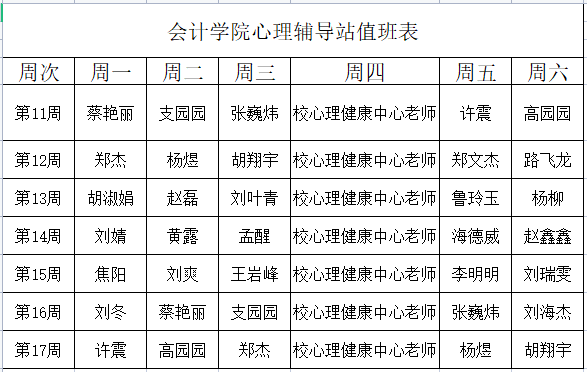本学期根据2021年秋冬季疫情防控要求和公司六天工作制实际情况,心理咨询老师排班安排具体如下,其中每周四为公司心理健康中心特派老师值班。