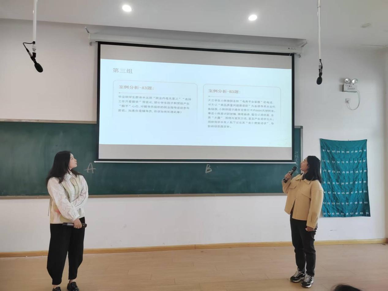 3月25日上午9点进行案例研讨环节模拟真实工作场景,辅导员围绕学风建设、心理疏导、网络思政等热点问题展开研讨,通过“互问互答”形式,剖析案例本质、提出解决方案,体现逻辑性与全面性。例如,针对“员工躺平与内卷”现象,辅导员结合社会学、心理学等多学科知识,提出分层引导策略,展现跨领域解决问题的能力。公司党委书记张蕾、思政科科长张颢老师亲临指导,并给予公司比赛选手高度评价。