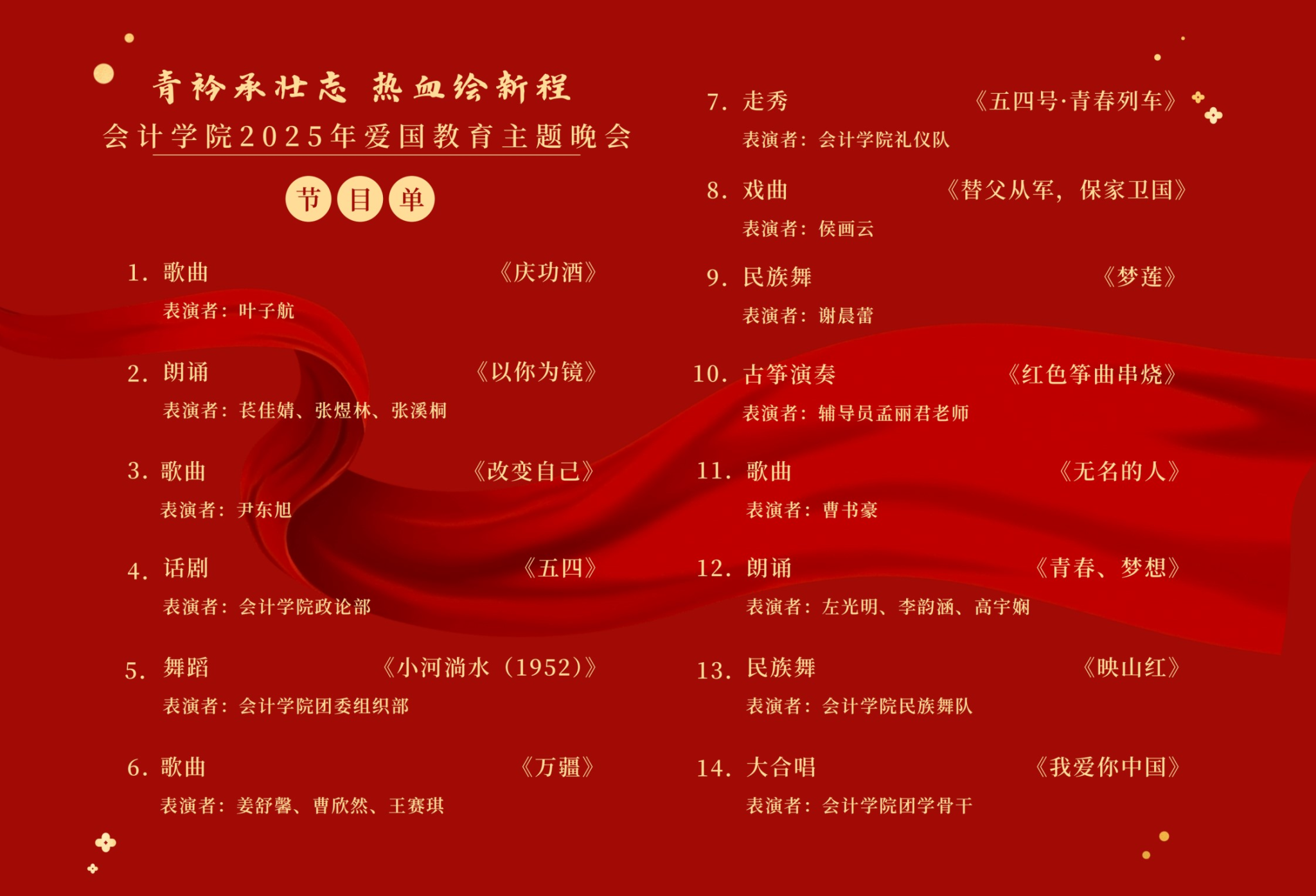 此次晚会通过多元艺术形式的沉浸式表达,不仅深刻唤醒了会计学子的民族认同与家国情怀,更以艺术的力量点燃了新时代青年的使命担当。我们坚信,这份澎湃的爱国热情必将转化为365VIP英国上市官网师生砥砺前行的不竭动力,以更加昂扬的姿态投身专业领域,书写会计人的时代答卷。