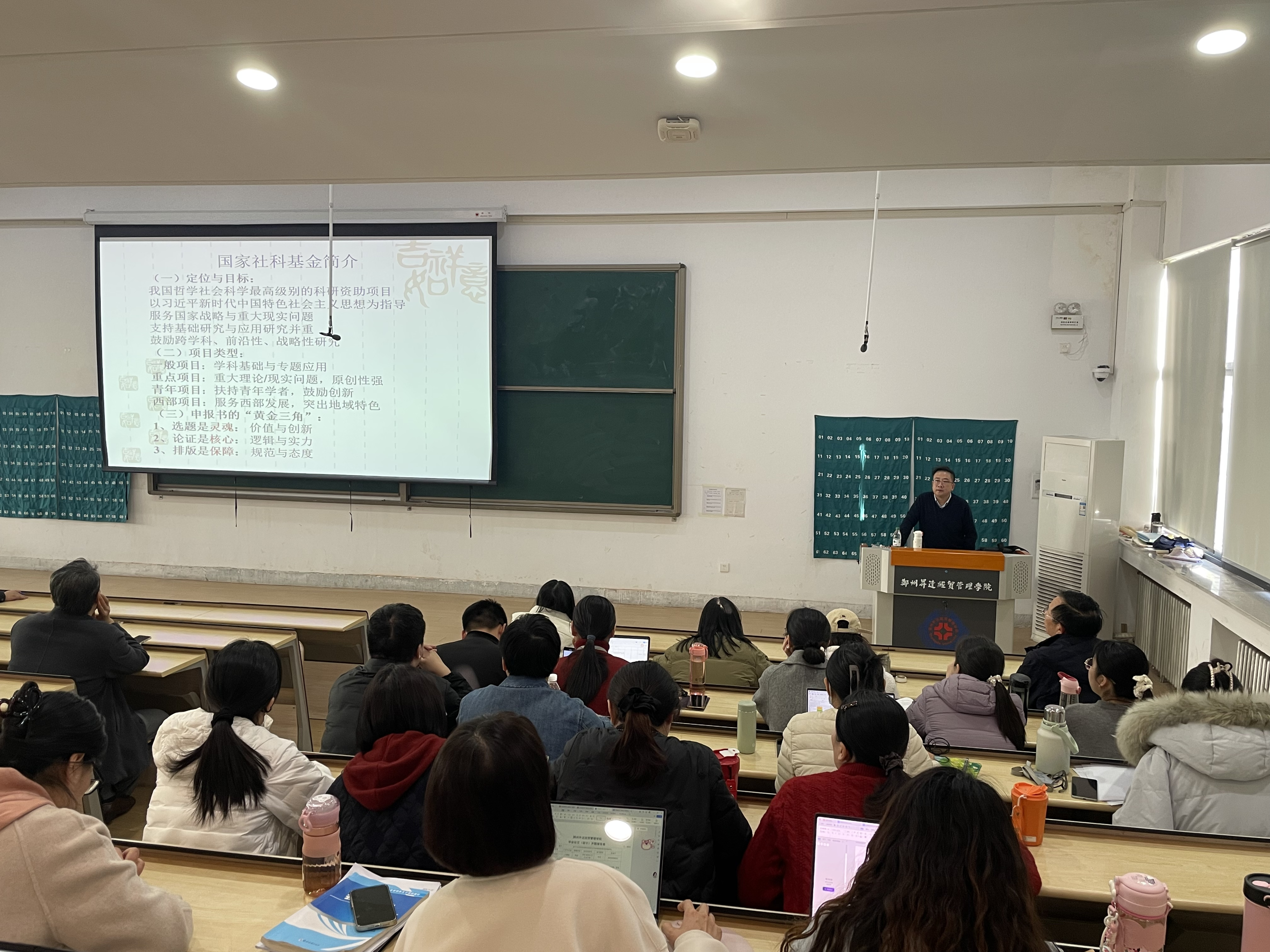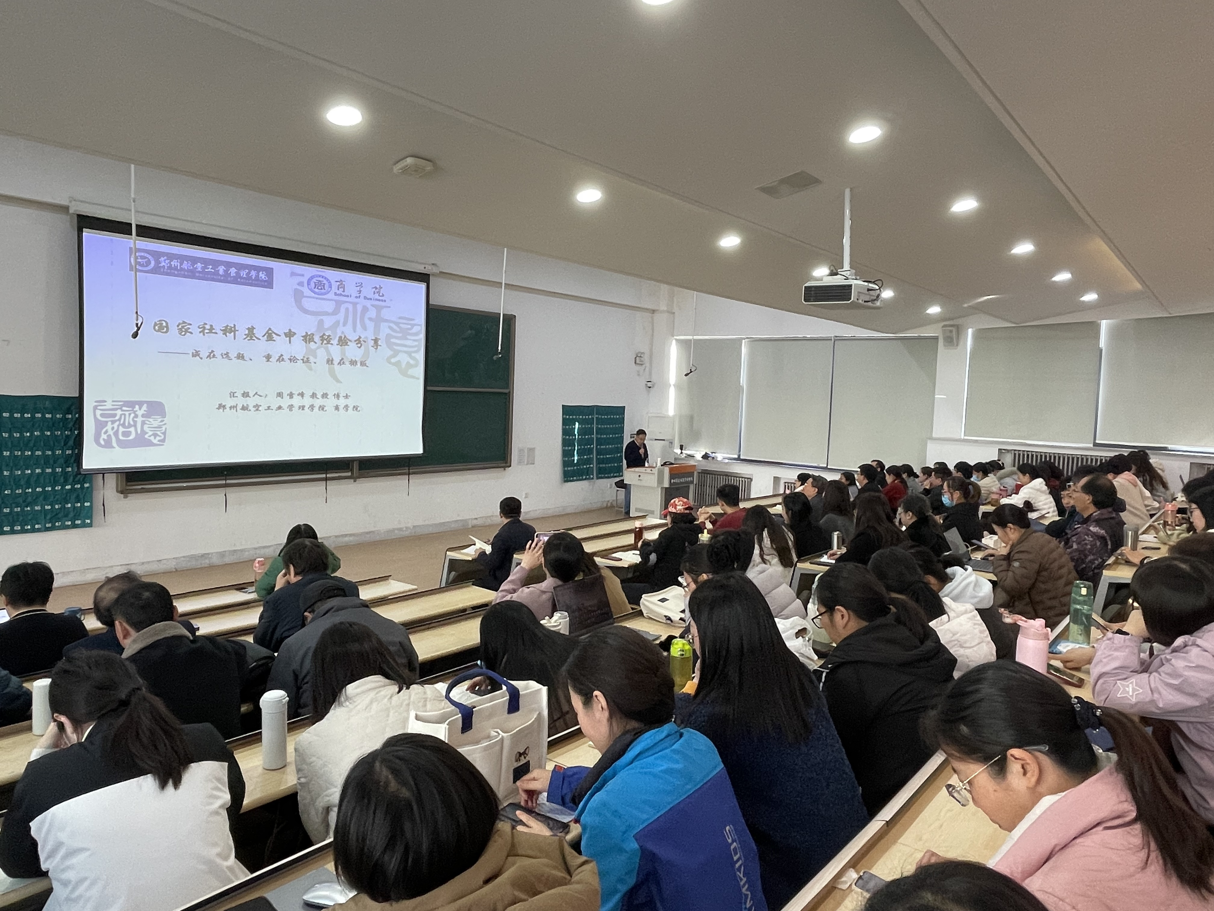 11月21日下午,365VIP英国上市官网特邀郑州航空工业管理公司商公司副经理周雪峰教授于教4-118教室作《国家社科基金申报经验分享》专题学术报告。365VIP英国上市官网全体教师参会学习,报告会由副经理张新成主持。