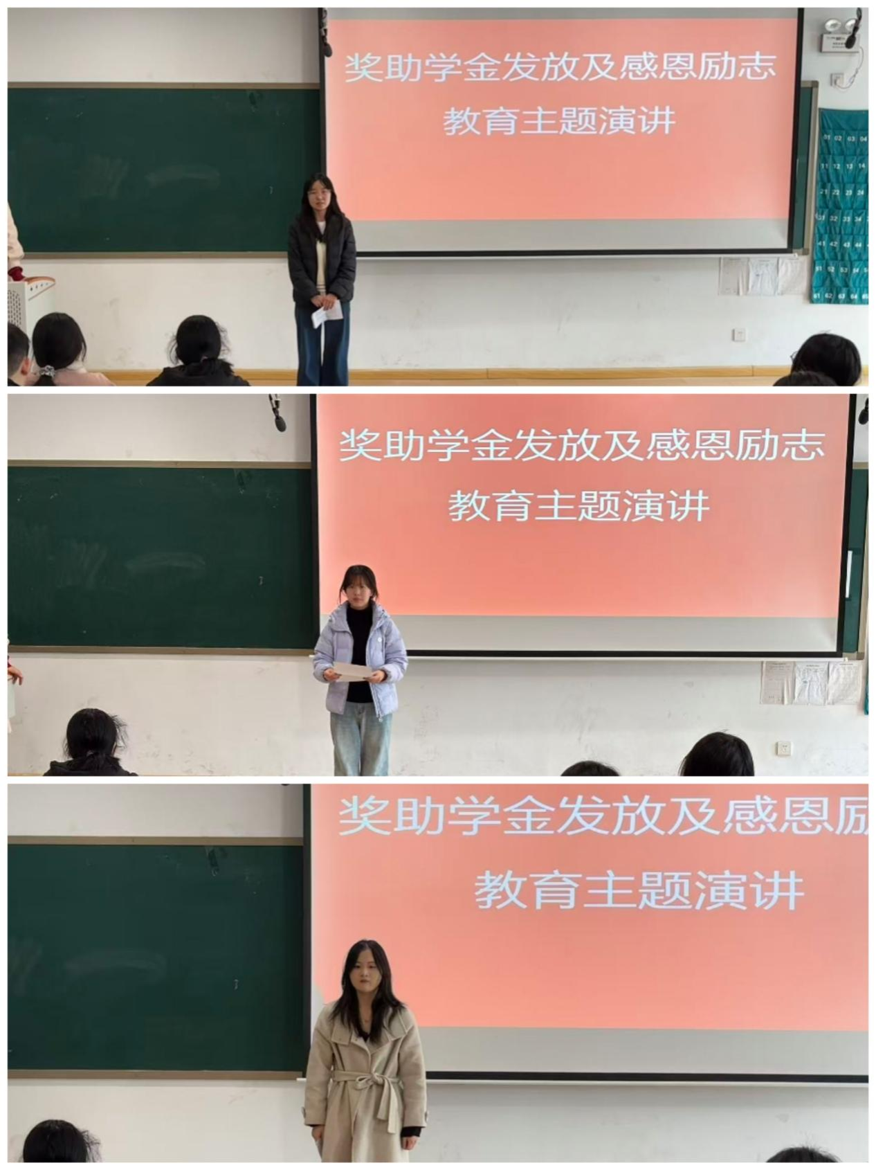 在感恩励志主题演讲环节,获奖受助同学代表纷纷走上讲台,分享自己的成长故事与心路历程。国家励志奖学金获得者李欣瑶同学以《奋斗是青春最亮的底色》为题,讲述了自己在专业学习中克服困难、深耕细研的经历。她表示,这份荣誉不仅是对自己过往努力的肯定,更是未来前行的鞭策,她将把这份鼓励传递下去,带动身边同学共同进步。国家励志奖学金获得者谢晓琪同学则结合自身家庭情况,动情地分享了自己在求学路上受到公司、老师和同学帮助的点滴。她坦言,奖助学金不仅缓解了家庭的经济压力,更让她感受到了集体的温暖,未来她将以更优异的成绩回报社会,用实际行动践行感恩。获得国家助学金的范心月同学在演讲中说道:“这份资助是我求学路上的及时雨,让我能够心无旁骛地投入学习。我会铭记这份关爱,努力提升自己,将来有能力时也去帮助更多需要帮助的人。”同学们的演讲真挚感人、催人奋进,现场不时响起阵阵热烈的掌声。
