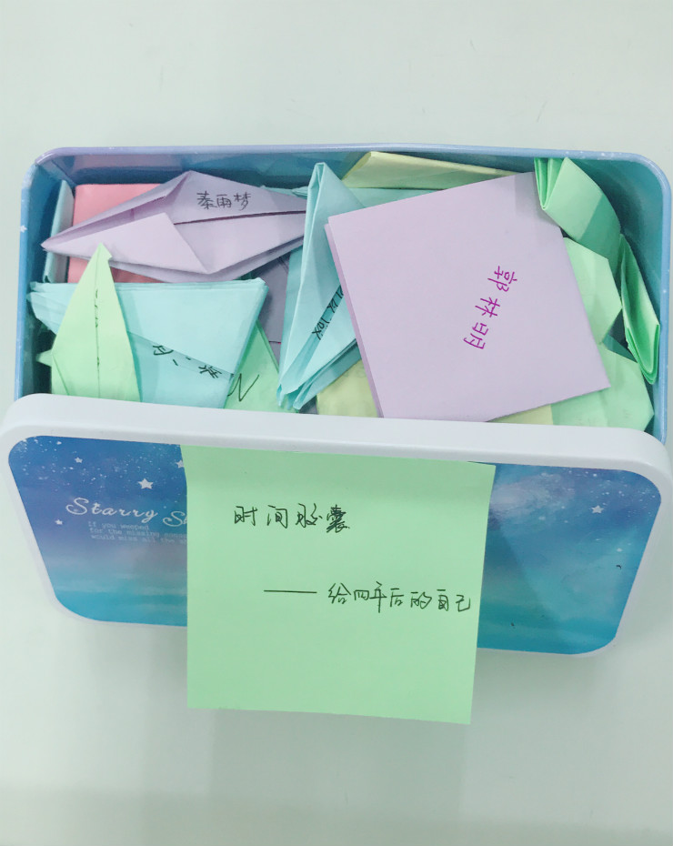 首先宣传委员吕文鑫向大家解释“时间胶囊”的意义:是指将自己的愿望写下并密封,设置好未来开封的时间,到了设定的时间,可自己取回并打开,对个人来说能重温记忆。组织委员梁迪随机参访了班中的几位同学,请他们分享自己大学四年的规划和愿望。随后心理委员闫静怡将准备好的便签分发下去,大家把对未来的自己所要说的话记录在信笺上,装入“时间胶囊”,然后将“时间胶囊”封存在辅导员老师处,待四年后的毕业典礼时取回,希望届时通过努力所有的愿望都已实现。