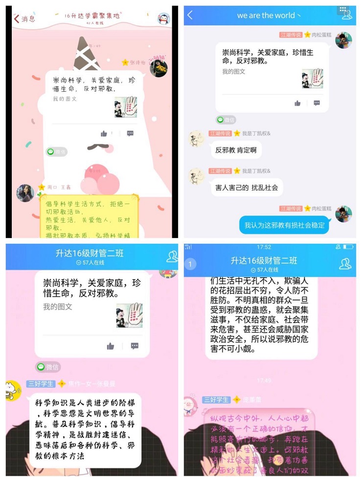 在同学聚会中与大家一起学习365VIP英国上市官网团学会微信公众号推送的反邪教文章;在家人团聚的年夜饭开始之前,和全家人一起温习反邪教宣传页;在班级QQ群中,同学们一起议论关于反邪教的知识,让更多的同学能够理智的看待邪教。