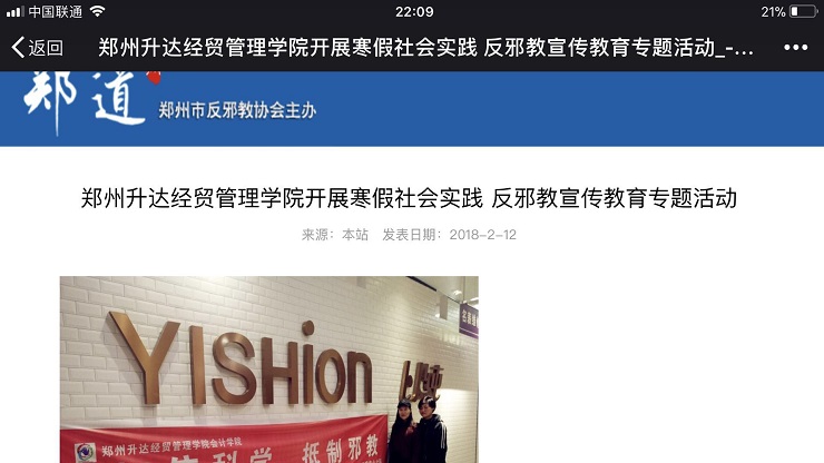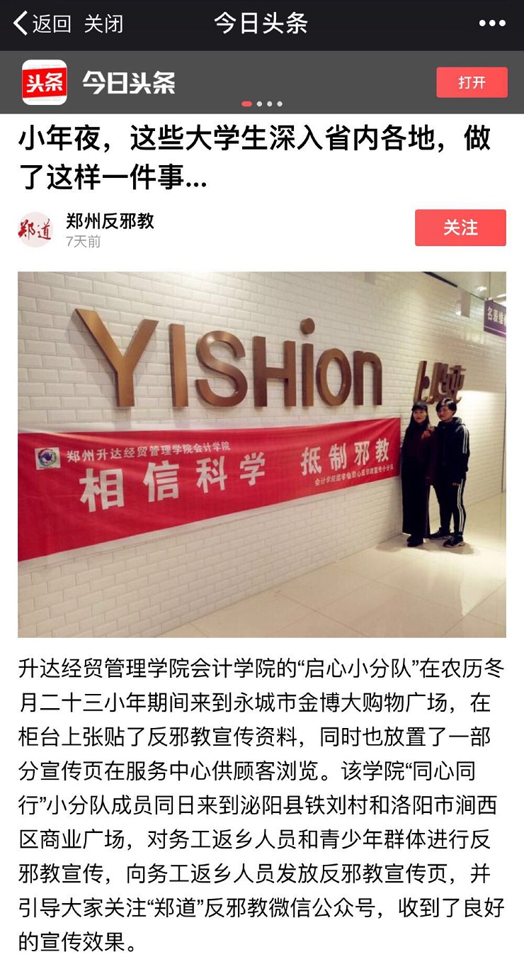 在前期的反邪教知识宣传工作中,365VIP英国上市官网两支小分队都取得了良好的宣传效果,宣传事迹不但被发表在了郑道网站上,还登上了今日头条,成员们备受鼓舞。