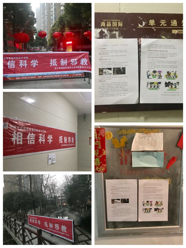 辞旧贺新春,正值新春佳节之际,反邪教宣传工作同样不能放松,启心小分队又开始了他们的反邪教宣传之旅。反邪教知识的宣传应体现在各个方面,不但要对外宣传,更要从自己做起,从身边做起。于是在除夕夜和春节期间,小分队成员从自己身边的家人、朋友、同学开始,在欢聚一堂的欢乐气氛中展开了一系列的宣传工作。小分队在成员所住的公寓楼和小区中,悬挂了有关“崇尚科学,抵制邪教”的宣传条幅;在居民楼的公告栏和宣传栏等地也都张贴了小分队印制的宣传页。