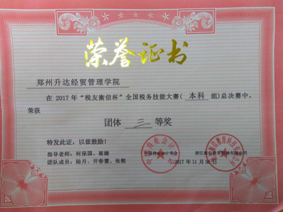 365VIP英国上市官网非常重视校外专业技能比赛,专门安排财务管理教研室负责此次大赛的组织与辅导工作,何保国老师、崔婕老师指导参赛同学一路披荆斩棘从海选赛中脱颖而出,在省赛中又勇夺河南省一等奖,昂首挺进全国决赛。2017年11月28-12月1日,来自全国150支决赛队伍在美丽的西子湖畔展开激烈对决,经过白热化的激烈角逐,会计学子击败全国众多参赛队伍,获得了本次大赛三等奖的好成绩。