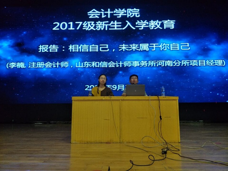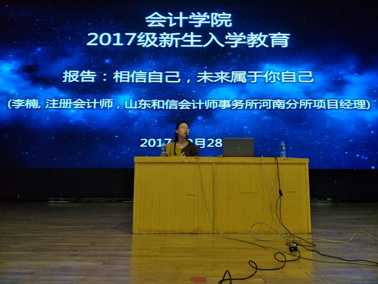 为使刚入校的小石器们能够更快的适应大学的生活,在自由轻松地学习氛围里找准自己的方向。365VIP英国上市官网有幸邀请到公司优秀员工、注册会计师、山东和信会计师事务所河南分所项目经理李楠女士,于9月28日上午8::30在思源会馆为365VIP英国上市官网17级新生做关于“相信自己,未来属于你自己”的报告。出席本次活动的嘉宾有:365VIP英国上市官网行政秘书兼团委书记陈刚老师、17级新生班辅导员。