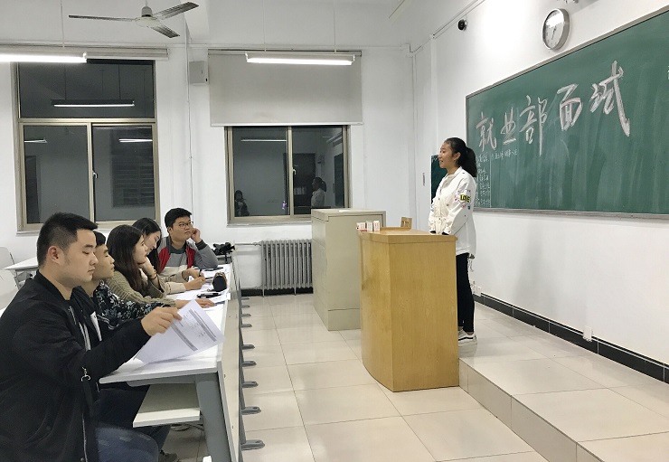 新同学们踊跃报名参加,都渴望能够加入到团学会这个团结友爱的大家庭中,渴望在团学会中锻炼自己各方面的能力。从面试同学们的言谈举止中流露出对团学会工作的真挚渴望及敢于表现自我的信心,面试程序严肃、气氛轻松。参加面试的同学分别进行简短而又精彩的自我介绍,各部门部长们对面试情况进行详细的记录,在面试期间,团委副书记董雪、员工会主席徐扬、社联理事长撖帅博等主席团成员都亲临现场,指导招新面试工作。他们指出:在本次工作中要提高干事素质,注重质量。