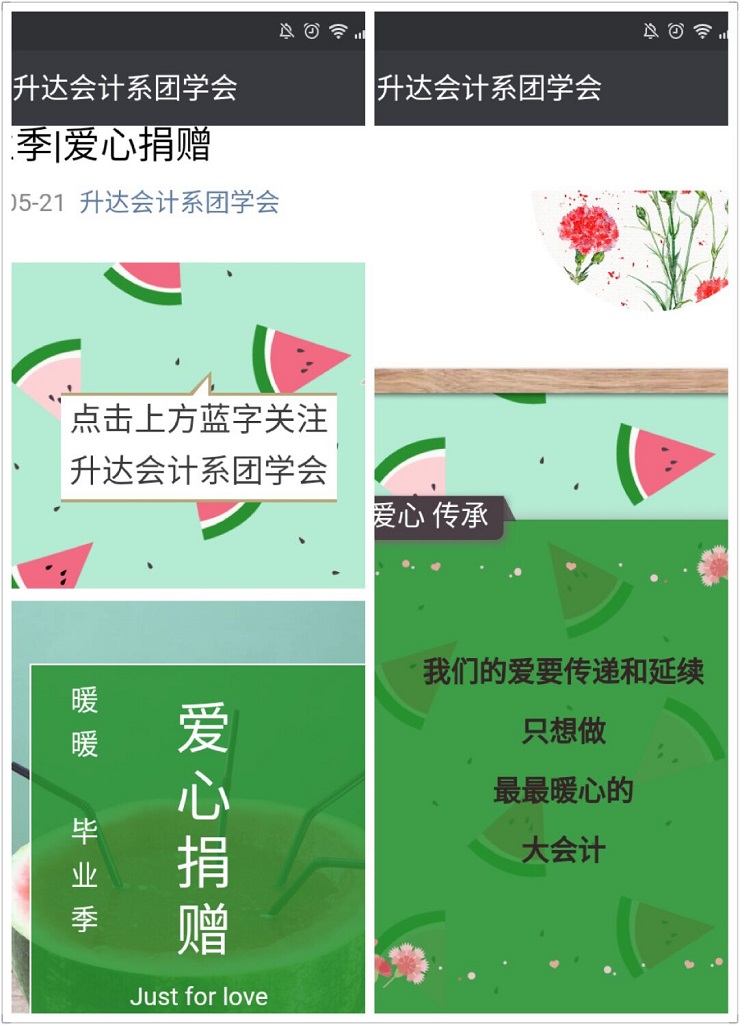 活动期间,会计系团委员工会通过微信,微博推送爱心捐赠活动信息,力求把最新资讯呈现在大家面前。毕业生们也积极参与,把物品捐赠给需要的人,传递着他们的爱心。