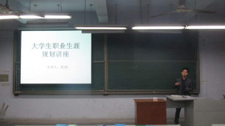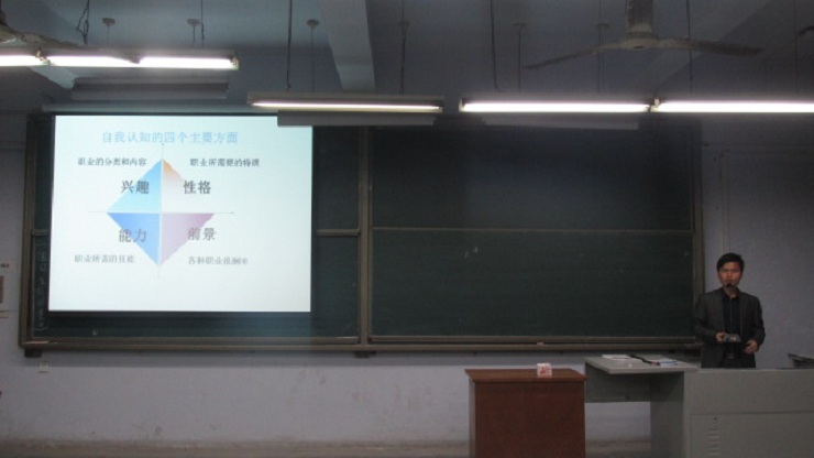 报告会在主持人的介绍下拉开了帷幕,程刚老师首先从自己对于未来就业情况的见解谈起。随后,程刚老师用播放PPT的形式,从自我认知、兴趣分析、性格分析、能力培养、个人建议,这五个大方面分别为大家的职业生涯做出大致的规划,又从每个大方面中细致地分析了幻灯片中一个个小的规划,同时又提出自己的建议与期望。