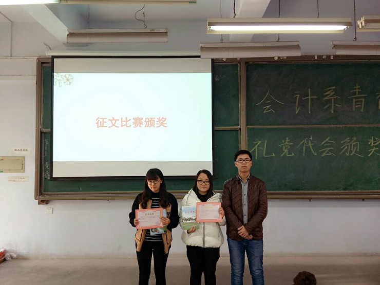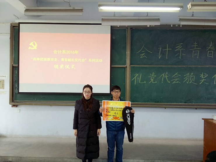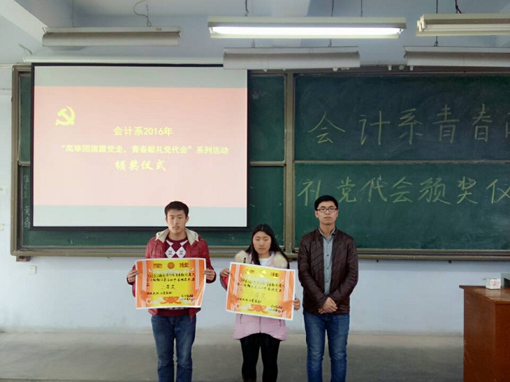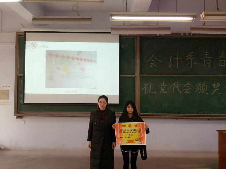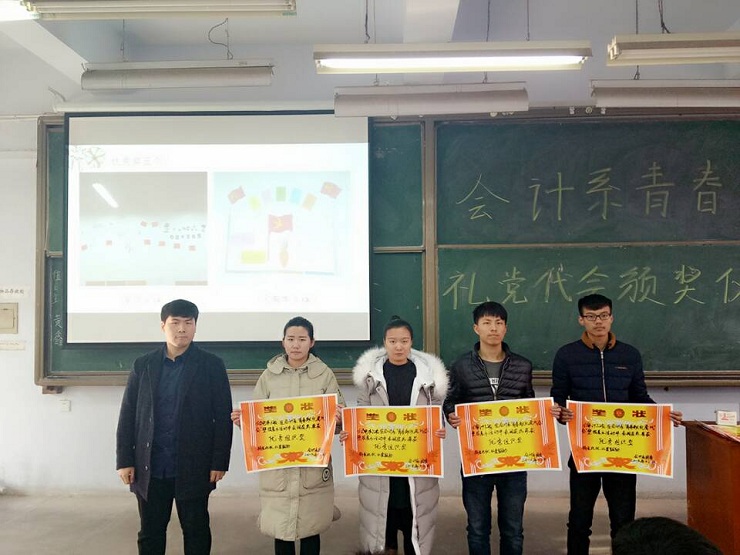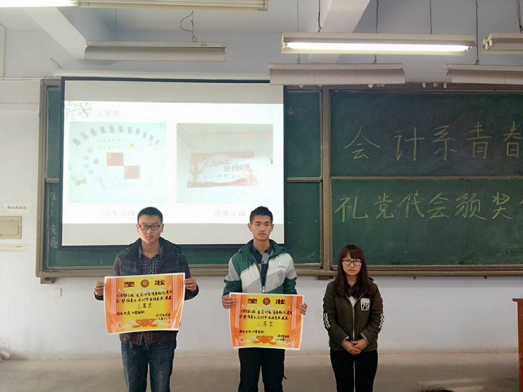 为全面提高员工对党代会的认识,引导广大团员青年开拓创新,拼搏奉献。会计系团委在近期举办了“青春献礼党代会”的征文、壁报、小视频等系列评比活动。经过层层筛选,12月15日中午12:30,会计系政论部在教学一号楼111教室举行颁奖典礼。参加本次活动的有:会计系团委副书记安琪、团委书记助理刘林矗、通讯部部长任宗娇、政论部部长撖帅博等。