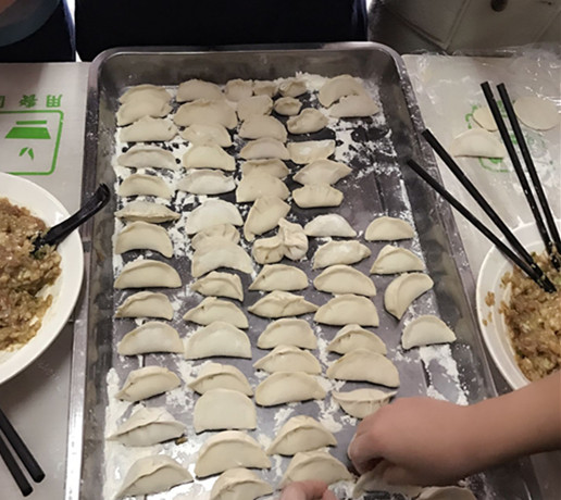 在活动过程中全体同学围在一起包饺子,尽管气温很低,包饺子的材料很冰,手很冷,但是同学们还是克服重重阻碍,乐在其中。当一盘盘的热饺上桌的时候,尽管它的外形可能并不算漂亮,味道并不算顶尖的,但是,当看到它的时候,洋溢在我们心里的是满满的满足,那是全体同学共同的成果,是我们相亲相爱的见证。