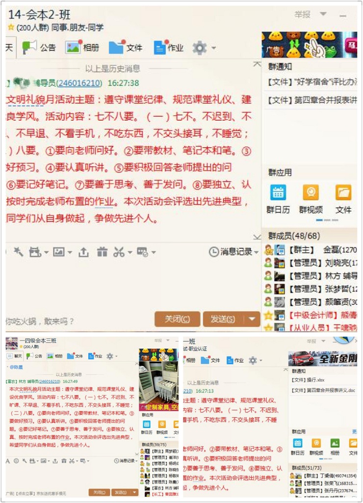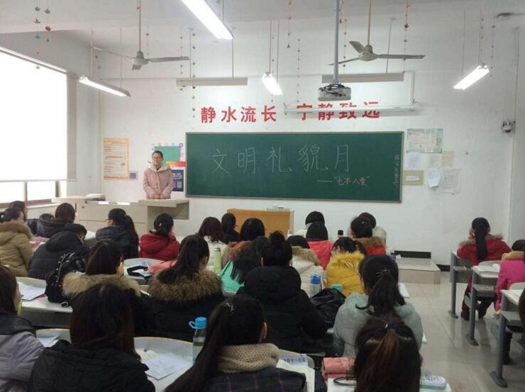 全系师生积极利用多种形式进行教育宣传活动,各班召开主题班会学习“七不八要”教育内容,即不迟到、不旷课、不早退、不看手机,不吃东西,不交头接耳,不睡觉; ①要向老师问好;②要带教材、笔记本和笔;③要做好预习;④要认真听讲;⑤要积极回答老师提出的问题;⑥要记好笔记;⑦要善于思考、善于发问;⑧要独立、认真、按时完成老师布置的作业。各班利用微信、QQ等新媒体平台对活动主题进行宣传教育,明确践行礼仪行为的重要性。同时,组织班级、员工积极落实“手机入袋”活动,从实际行动上确保了良好的课堂秩序,并鼓励员工踊跃参加文明班级、文明个人的评选。