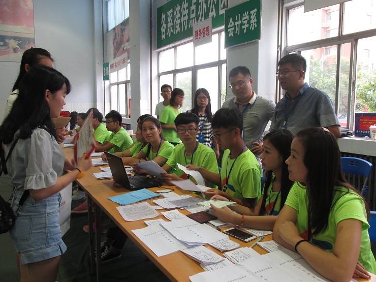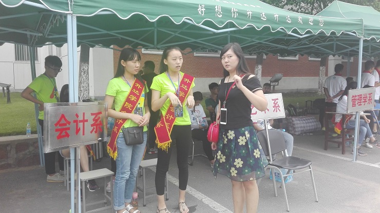 为保证迎新工作顺利完成,系领导老师们在公司迎新工作部署的基础上进一步细化了相关流程。9月3日当天早上7点,正式迎新工作就如火如荼地开始进行了:统一身着充满青春活力的荧光绿色T恤的团学会成员们悬挂横幅、搬桌椅、搭帐篷,做好各项准备。到处都是忙碌的身影。有的在行政楼旁举引导牌接待指引,有的在接待处耐心解答同学和家长们的疑问,有的微笑着热心地为新生办理各项手续,有的挥汗如雨,帮助新生运送行李,无论是在场的领导、老师还是同学们都能够满腔热情,细致入微。