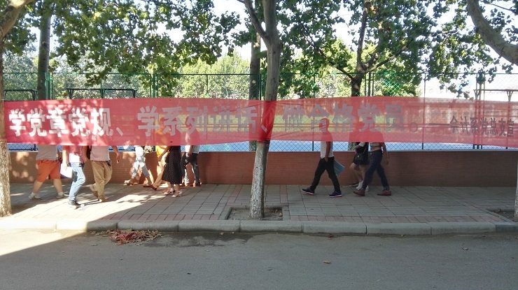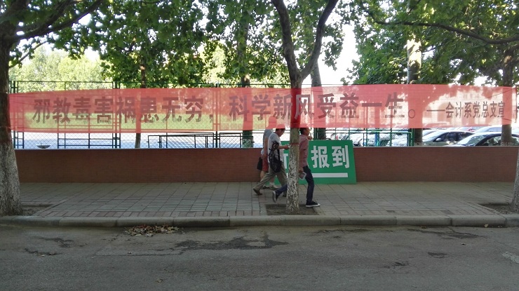为加大“两学一做”活动的宣传力度,并在新生入校之际宣传反邪教知识,会计系党总支在教学楼附近以及迎新生服务点悬挂了“两学一做”、抵制邪教的宣传条幅,还张贴了“崇尚科学、抵制邪教”的宣传海报,为新生宣传防邪教知识,使新生一入学就感受到了满满的正能量,体会到了党的关爱之情。