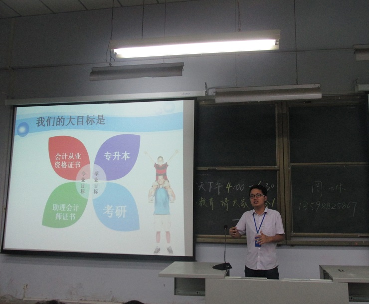 报告会开始前,会计系行政秘书兼团委书记陈刚老师代表系领导、老师对同学们的到来表示热烈的欢迎,并希望大家及早确立目标、尽快适应老员工活,鼓励大家在以后的学习和生活中全面提升自我。