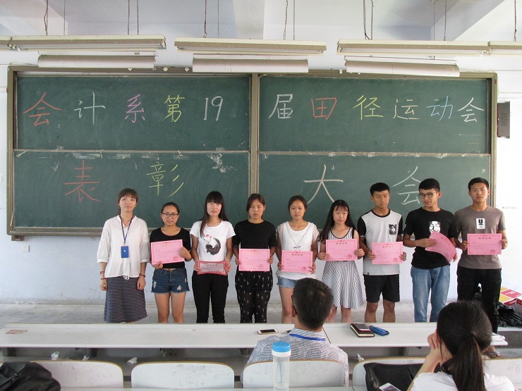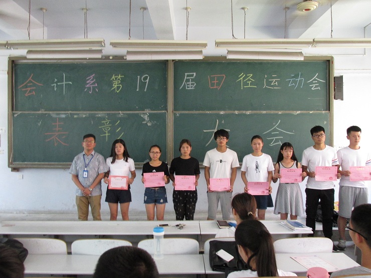 为了表彰田径队在运动会中取得的优异成绩,积累本次田径队运动会的经验。6月16日中午12:20在教学1号楼111教室举办了会计系第十九届田径运动会表彰大会。出席本次会议的嘉宾有会计系行政秘书兼团委书记陈刚老师、行政秘书刘锦老师、田径队训练负责人杨煜老师及员工会主席汤嘉伟。大会现场掌声不断,大家都为运动员们感到骄傲。