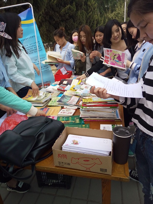 下午2点活动开始,图书和信纸静静的倚靠在桌上等待着那一颗颗爱心将他们挑选;而我们会计系微益青志协的志愿者们也不畏炎热在大大的阳光下,始终坚守岗位,给每一位前来购买的同学认真讲解活动,有些志愿者因忙碌而忘记吃饭,还有些志愿者为使筹集到更多善款,而自己购买图书,邮寄书信。