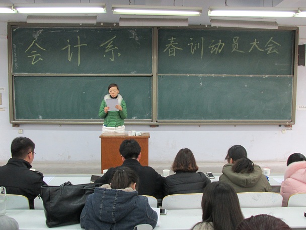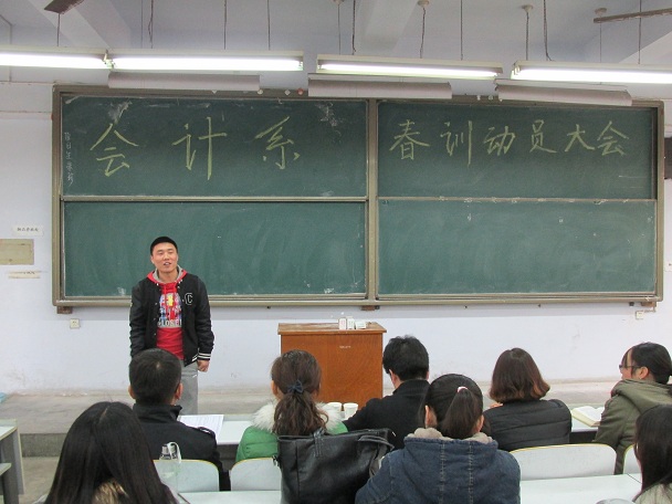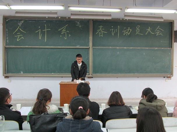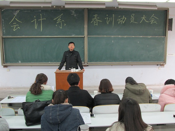 我运动,我自信,我健康,我快乐。为了调动运动员们参加体育锻炼的热情,加强自身锻炼。3月9日中午12:30,会计系春训动员大会于会计系1号楼108教室如期举行。莅临本次会议的嘉宾有会计系行政秘书兼团委书记陈刚老师、会计系行政秘书刘锦老师、会计系辅导员张巍炜老师、张涛老师、陈晓老师、李南方老师、陈姣老师、鲁玲玉老师、丁向育老师、郭俊东老师、杨煜老师以及团委副书记成磊、员工会主席汤嘉伟、员工会副主席温冉冉。