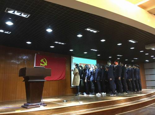 伴随着庄严肃穆的《国际歌》,仪式正式开始。首先,彭丽老师带领55名新党员举起右手,面向党旗郑重宣誓,铿锵的誓言表达了他们正式加入中国共产党的激动心情和为党和人民的事业奉献终身的决心。