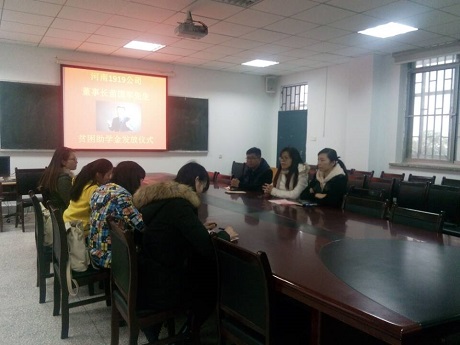 11月23日中午12:30,由会计系94级优秀员工、河南1919公司董事长苗国军先生出资的贫困助学金发放仪式在会计系114会议室顺利举行。会计系主任张欣副教授、行政秘书兼团委书记陈刚老师、行政秘书刘锦老师、辅导员乔焱宁老师和获奖同学参加了本次授奖仪式。本次授奖仪式由陈刚老师主持。
