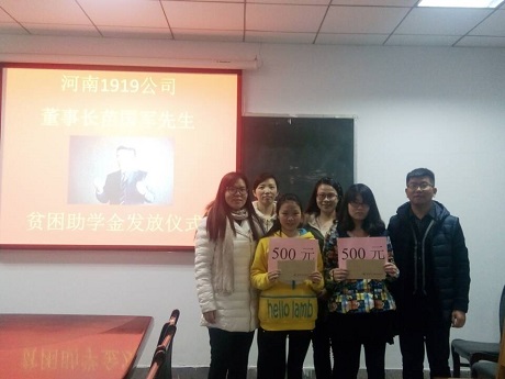 通过层层筛选,获得本次“贫困助学金”的分别是表现突出的13级会本二班李阳阳同学和13级会本五班杜玉莲同学,获奖的两位同学表示将把员工的关爱与领导老师的嘱托化作继续奋斗的动力,时刻以优秀员工为榜样。最后,由张欣主任,陈刚老师、刘锦老师为她们每人颁发500元贫困助学金,并合影留念。