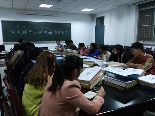 校园是传播科学文化的神圣殿堂,是培养社会人才和建设者的重要阵地。为提高老员工的明辨是非的能力,10月18号晚6:30,会计系于教学一号楼114会议室召开“反对邪教,崇尚科学”主题会议,行政秘书兼团委书记陈刚老师,以团委副书记成磊,员工会主席汤嘉伟,社联理事长张千为代表的主席团成员及各部门部长出席了本次会议。