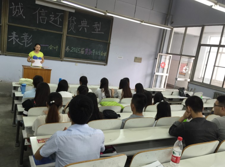 2015届毕业生本周开始办理毕业生离校手续,尚有部分贷款员工未还清国家助学贷款,为确保我系助学贷款工作的正常开展及良性循环,会计系于毕业典礼前一天在会计一号楼教室召开了“诚信还贷典型表彰——会计系2015届助学贷款毕业生会议”。