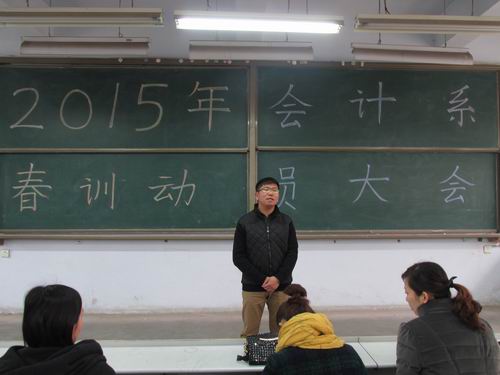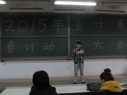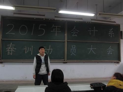 3月18日中午12:30,会计系2015年春训动员大会在教学一号楼111教室召开。出席此次大会的有:会计系行政秘书兼团委书记陈刚老师、行政秘书刘锦老师、团委常务副书记焦阳老师、14级年级团总支书记海德威老师、田径训练负责人杨煜老师、14级全体辅导员老师和我系田径队队员、体育部成员。