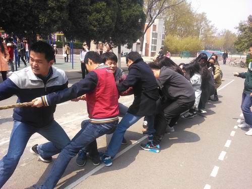 此次比赛每部门均派一支队伍,采取抽签的方式分组比赛,比赛实行淘汰制晋级方式。随着比赛的哨声响起,双方队员握紧绳子,他们一个个脚蹬着地,身体向后倾,拼命向自己的方向拽绳子。队员们口中高呼“一二,一二”,不管男生女生,都抱着“誓死”捍卫自己领地的决心。近看,有的手臂上青筋暴起,有的鞋子扭曲变形,有的衣服被风高高的吹起,可是谁也不服软,就这么咬牙坚持。绳中间的红绸带一会儿偏左,一会儿偏右,双方互不相让。部里的其他队员们,都为本部选手加油助威,场内呐喊声、加油声、口号声此起彼伏,回荡在空中。