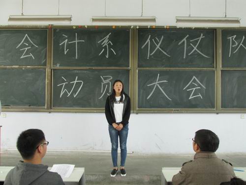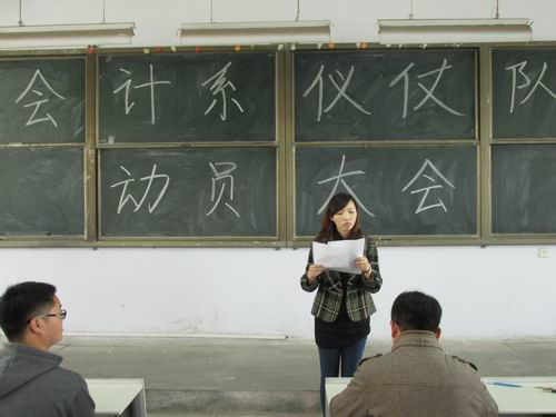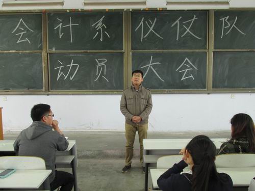 为迎接即将到来的公司春季运动会,做好仪仗队训练工作,展示会计学子良好的精神风貌,4月20日中午12:30,会计系在教学1号楼108教室召开了仪仗队训练动员大会,出席此次会议的有会计系行政秘书兼团委书记陈刚老师,行政秘书刘锦老师,14级年级团总支书记、辅导员海德威老师,14级辅导员王超锋、张晓、刘宪、杨煜、远洋、林方、何景毅等人以及我系14级各班选拔出来的仪仗队员近200人。