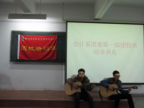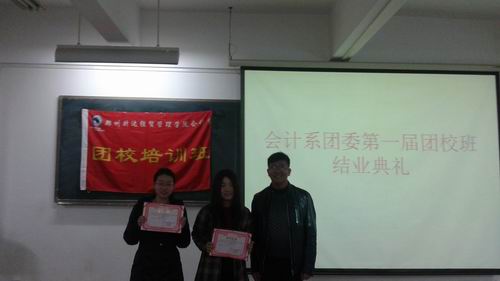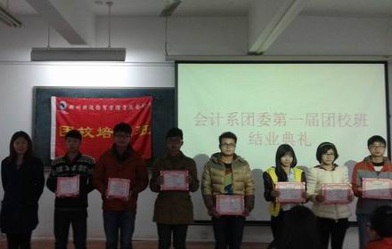 12月29日晚上6:30,会计系团委第一期团校培训班结业典礼在资讯楼409教室顺利举行,会计系团委书记兼团校董事长陈刚老师,会计系团委副书记王纯,员工会主席刘乾坤,书记助理杨博博、杨致远,办公室主任刘晓光,组织部部长柴悦君等人与本期团校学员70余人出席了此次结业典礼。