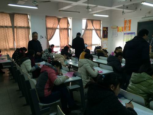 1月19日是本学期期末考试公司统考的第一天,上午9:00,会计系张欣主任、教学秘书何保国老师、行政秘书陈刚老师、刘锦老师到会计系各考场进行巡视,对期末考试的考风考纪情况进行检查。