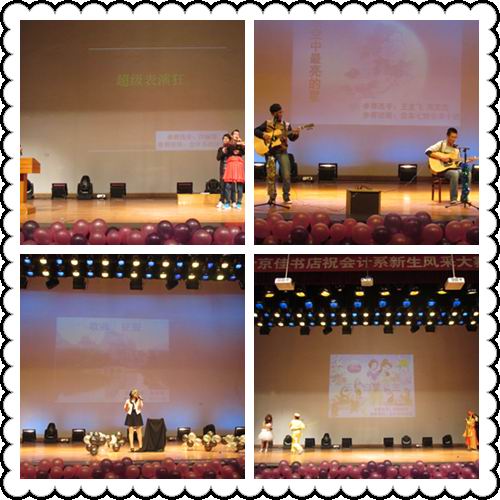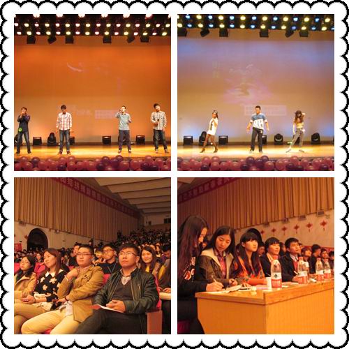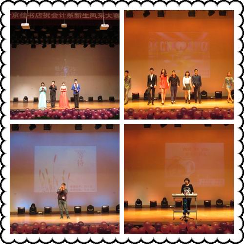 在主持人开场白之后,第一个出场的是T台秀,同学们的高雅气质瞬间将比赛带入一个时尚、动感的氛围;吉他弹唱《夜空中最亮的星》将观众带到了静谧的夜空;歌曲《浮夸》、《追梦赤子心》、《等待》、《喜欢你》,舞蹈《茉莉花》,电子琴弹唱Wait for you 、《梦中的婚礼》等节目更是博得了观众们的阵阵掌声;小品《超级表演狂》、话剧《三打白雪公主》诙谐幽默,夸张而又滑稽的表演也为大赛增添了别样的风采;最后,酷帅火辣的街舞为大赛画上了完美的句点。