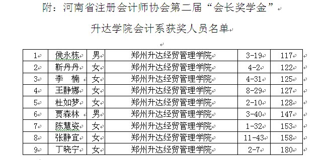 11月6日公司接到河南省注册会计师协会“豫会协【2014】71号”文件通知,公司会计系侯永栋等九名同学喜获第二届“会长奖学金”,总金额达18000元。