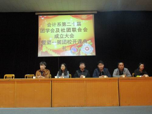 10月27日晚上6:30,会计系第二十届团学组织成立大会暨第一届团校开课典礼在龙湖报告厅隆重举行。出席现场的有会计系团委书记陈刚老师,14级年级团总支书记、辅导员海德威老师,辅导员王超锋、何景毅、远洋、张晓老师。会计系第二十届团委员工会、社团联合会全体成员以及全系2014级各班班长、团支书500余人参加了此次大会。