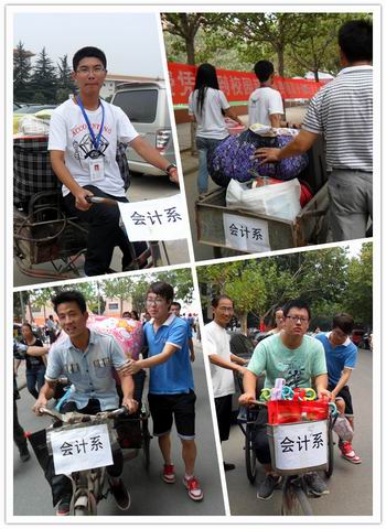 9月4日早晨7:00,会计系团学会工作人员已在各个服务站点准备就绪,开始了迎新生的工作。行政大楼旁停车场迎新的学姐以最美的微笑为学弟学妹们指路,并带领他们到思源会馆西侧的会计系大本营。在那里,学长学姐认真核对通知书、身份证和准考证信息,发放报到程序单,并提醒他们需要准备的东西。随后,由团学干部带领进入体育馆进行报到注册。体育馆内,工作人员从缴费到验收缴费单,办理一卡通,再到安排宿舍,每一个环节都是那么井然有序。新生办完所有手续后,在工作人员热情的指引下在思源会馆与家长会和。接着,我系团学会工作人员以及志愿者脚蹬三轮车为新生搬运行李,直至宿舍,并耐心地为他们解答问题,充分做到了“接过你的行囊,我们就是一家人”的亲情服务,让新生和家长感到了会计系家庭般的温暖。