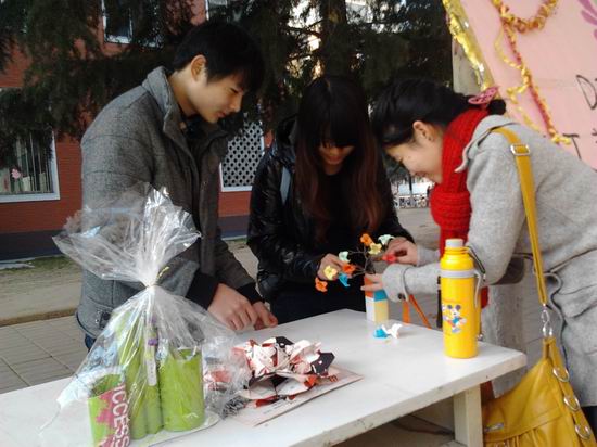 其中,用绿色废旧卡纸和旧笔做成的“环保纸笔筒”美观大方,绿色又象征着环保和希望;折纸工艺品——“让世界充满爱”,使用废旧报纸折叠而成,循环利用切合环保创新的主题,而且四颗红色心形的底座上面镶嵌着红花,象征着班级团结,寓意深远;用废旧毛线制作的“毛线小人偶”俏皮可爱,洋溢着青春的气息;用碎布和树枝制作的假花非常逼真,在冰冷的冬季让人感觉到了生命的活力……