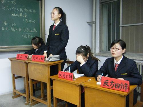 第一场辩论赛,正方是来自会本四班的代表队,他们所持观点是“个人的命运是由社会掌握的”。反方是来自涉会一班的代表队,他们的观点是“个人命运是由个人掌握的”。首先,正、反方一辩做四分钟的发言,他们开门见山地阐述了他们各自的观点。接下来,正反方二、三辩选择对方二、三辩进行一对一攻辩,双方你来我往,气氛热烈,牢牢坚持自己的观点,场上“火药味”十足。紧接着,正反方一辩对刚才的攻辩进行小结,他们均犀利地指出了对方言辞中出现的问题,也更加确立了己方的观点。接下来便是大家最期待的自由辩论环节,正方四辩率先发言,用一个简单的例子说明了自己的观点,反方变被动为主动,把本次辩论赛的气氛推向一个高潮。双方你来我往,针锋相对。经过一番唇枪舌战之后,最终涉会一班以绝对优势取得了第一场比赛的胜利,由10级辩论队主力余浩对第一场比赛作出了精彩的点评。