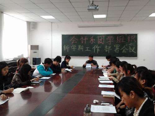 3月7日下午四点,会计系团学会在会计系一号楼会计会议室召开2013年新学期的第一次会议。参加会议的有团委书记陈刚老师、员工会主席吴亚玮、团委副书记沈祥、社团联合会理事长孔维超以及各部部长。