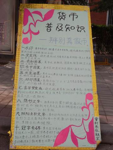 为了使同学们更加了解货币相关知识和辨别货币真伪的方法,在院团委主办、会计系团委承办的公司第一届中博杯“金手指”大赛活动期间,会计系团委制做了相关的展板和图片,开展了货币知识普及活动。