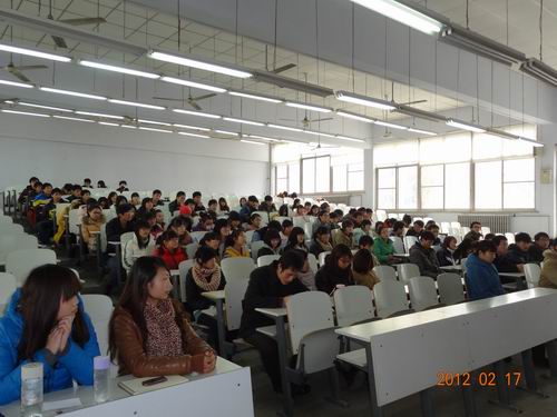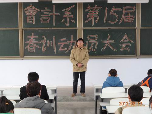 2月17日中午12:40,会计系春训动员大会在教学一号楼108教室如期举行。出席此次大会的有会计系行政秘书兼团委书记陈刚老师、行政秘书助理刘锦老师、团委常务副书记焦阳老师、田径队总教练王彬老师以及2011级辅导员高晓阳、李南方、陈姣、赵磊等老师。此外,会计系田径队运动员及团学干部百余人参加了大会。