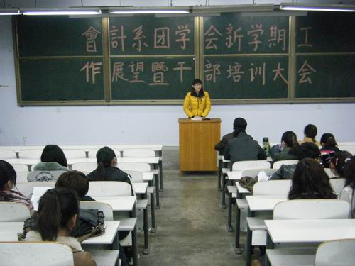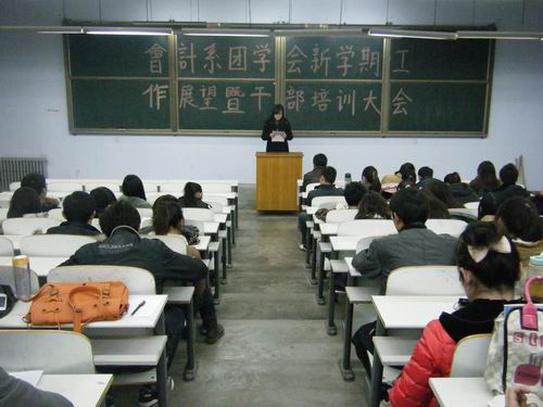 为了使我系团学会各部门本学期目标更加明确,更好地开展工作,进一步提高工作能力,2月22日晚上6:00,会计系在教学一号楼108教室召开了团学会新学期工作展望暨干部培训大会,会计系行政秘书兼团委书记陈刚老师、常务副书记焦阳老师、团学会主席团成员及各部门的部长、副部长共同参加了本次大会。