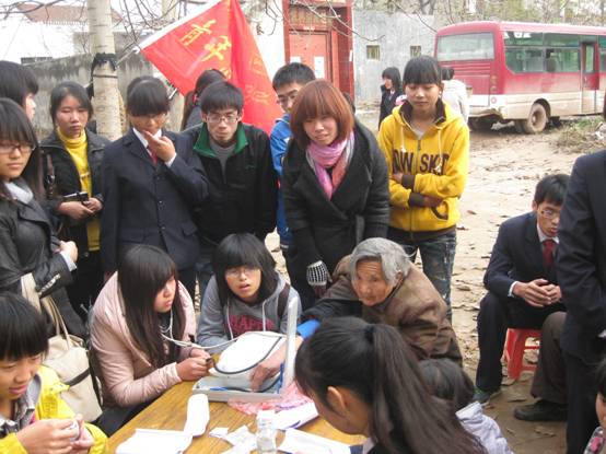 2011年11月19日,会计、国贸两系青志协的志愿者们一道驱车前往西泰山,义务为老人们量血压,测血糖。虽然早起仍有一丝寒意,但同学们的脸上依旧挂着热情的微笑。