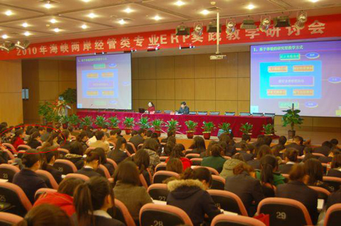 4月15日,2010年海峡两岸经管类专业ERP实践教学研讨会在成功公司隆重召开。本次研讨会是由河南省教育厅主办,成功公司承办的一次高水平的学术交流大会。河南省科技创新促进委员会赵晓广会长,河南省教育厅高教处李培俊副处长出席了大会,来自北京交通大学、台湾苗栗育达商业技术大学、郑州大学、河南大学、郑州轻工业公司、安阳师范公司、信阳师范公司、金蝶软件(中国)有限公司、隆庆祥服饰有限公司等海峡两岸27所高校、10余家知名企业的80余位专家参加了此次会议。其中会计系崔杰、吕永霞、毕鹏翾、蒲敏四位老师参加了此次教学研讨会。