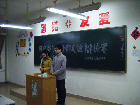 3月31日,会计系风纪部部和生活部关于“谦虚与自信哪个更重要”友谊辩论赛在商管楼405举行。辩论赛的评委由会计系风纪部和生活部的部长和副部长担任,辩手由两个部门的干事组成。