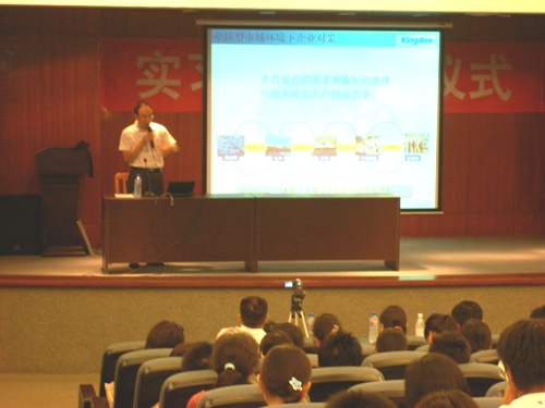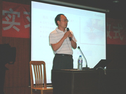 他认为,新经济时代,互联网已经将地球变成“地球村”,我们的一切正在数字化,是一个快鱼吃慢鱼的时代。新经济时代的企业根本不同于过去的企业。他着重介绍了国外国内ERP的发展进程,企业信息化对毕业生的变革和新的要求。他用大量的图片和数字,让员工深切感受到信息化时代给就业带来的冲击和挑战。他用大量的数据和成功案例,激起员工对从事ERP行业的极大兴趣。他还表示要来校招聘公司毕业生,和大家一同进入信息化时代的企业,参与更加激烈的竞争。