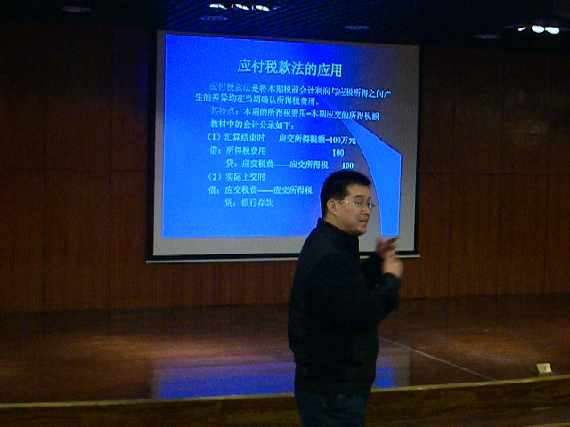 然后,方教授介绍了从2008年1月1日起开始实施的《中华人民共和国所得税法》,从所得税知识和会计实务知识两方面,详细讲解了所得税业务阶段应当如何纳税,并且详细列举了间接法下纳税调整增加额和纳税调整减少额都有哪些。其间穿插经典生动案例,使专业性极强的知识变得生动具体,易于理解,现场气氛活跃,师生间交流融洽。