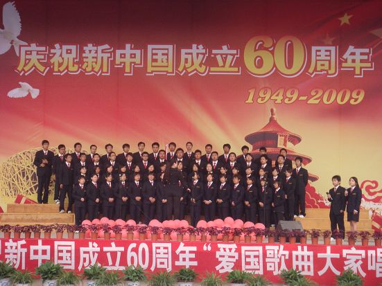 国庆节前夕,公司院文艺部组织了举办了新生“红歌会”。阵阵脍炙人口的经典革命歌曲从艺文广场传出,响彻整个校园。此次活动,大一新生全部参加,旨在庆祝祖国的六十岁华诞,宣扬革命精神和爱国情操。